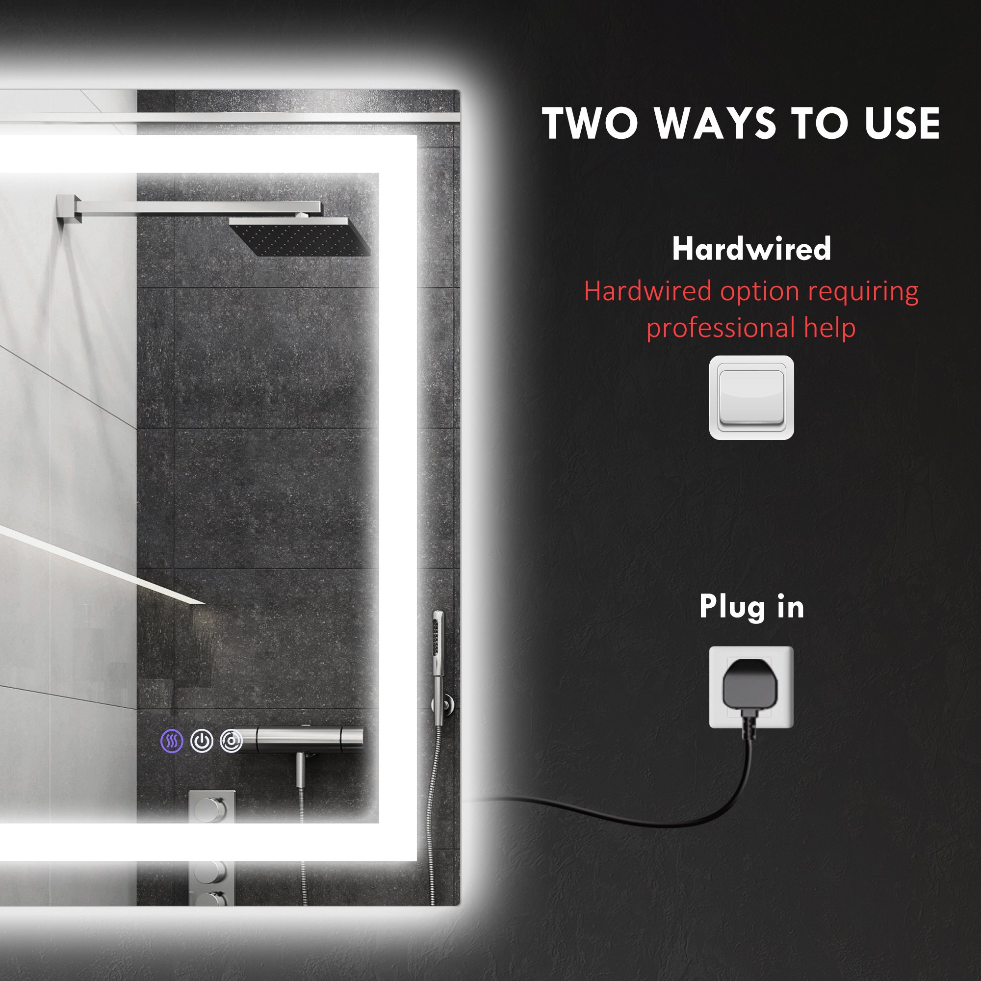 Simple: Our lighted bathroom mirror is easy to install with included mounting hardware. It has wall brackets for secure hanging vertically or horizontally and can be installed with a plug or hardwired connection (if you opt for hardwired installation, you must handle the wiring independently.)