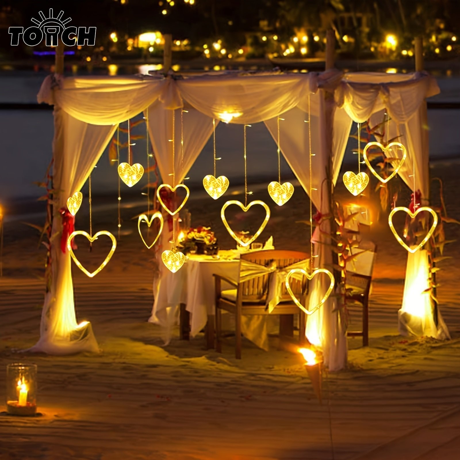 Heart Shape Light (Warm White) Material: strong copper wire LED Type:138 led lights in total. There are 12 heart pendants. The small heart have 10 cm in diameter and the droop length is 60cm; the larger heart has 20cm in diameter and the strip length is 90cm. Lighting mode:8 flash mode: Combination; Waves; Sequential; Slo-glo; Chasing/Flash; Slow Fade; Twinkle/Flash; Steady on Power: 3*AA(Exclude) or Insert USB interface. Whether indoor or outdoor; you can choose any method conveniently.