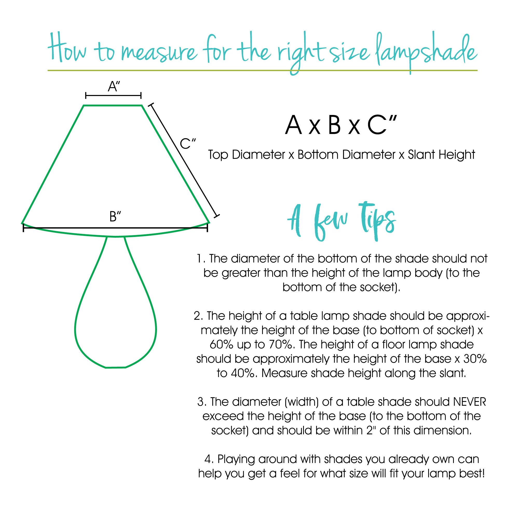 Shade measures 6" top diameter x 12" bottom diameter x 8" slant height