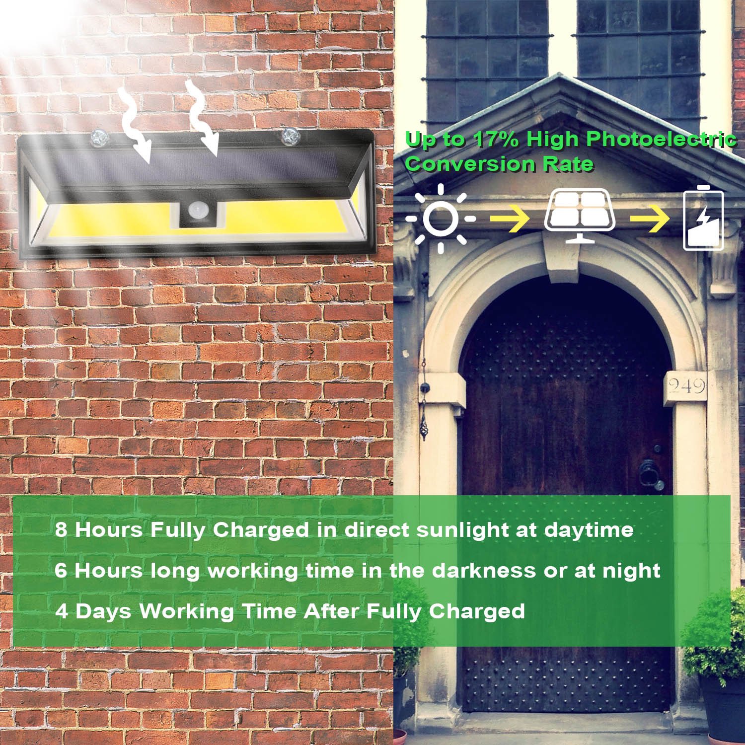 *4 Days Working Time*:Its solar panel with 17% high photoelectric conversion can effectively absorb the sunlight on the day and convert sunlight into electricity to fully charge the inbuilt dual 2200mAh about 7 hours. Auto on at night when motion is detected in darkness or at night, and become bright for 30 seconds. If the solar light lights up 50 times a night,it can work continuously for 4 days, durable and eco-friendly.