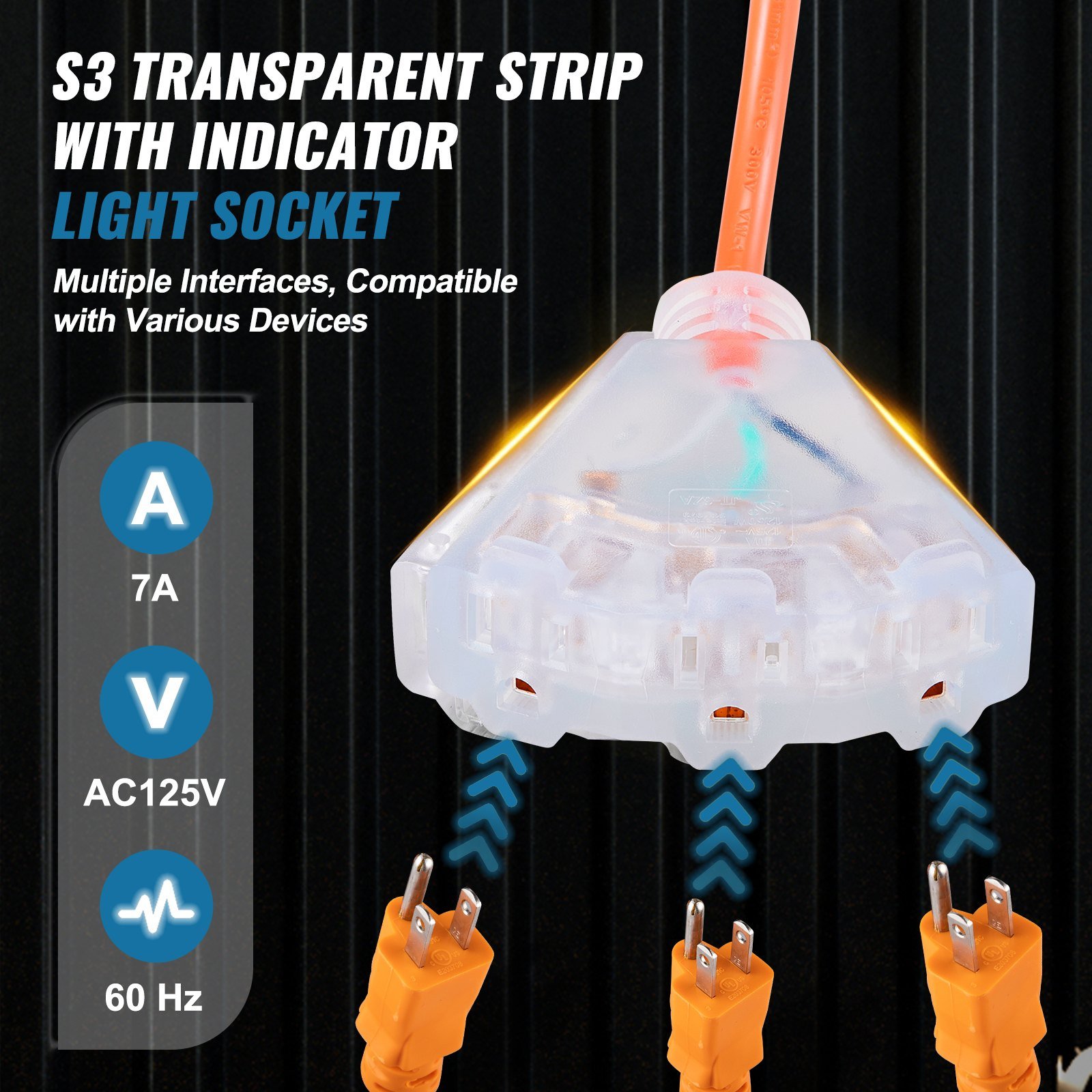 The extension cord is made from high-quality SJTOW cable and is ETL certified. The 30 ft long SJTOW cable is outdoor waterproof and oil-resistant, suitable for various challenging environments, ensuring durability.