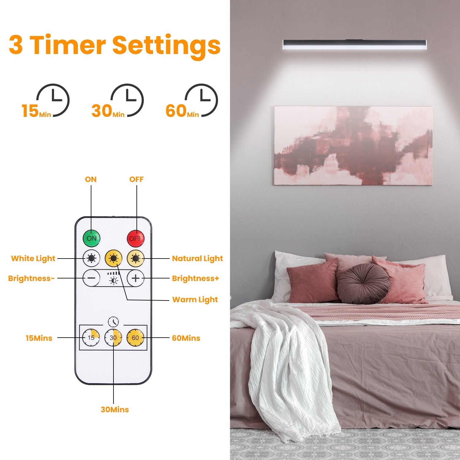 *Picture Light For Wall*:With 3 distinct light colors(White/Warm/Natural),this wireless picture light is definitely perfect for highlight your picture frame, canvas artwork, wall artworks,mirror,dartboard,portraits,gallery,photos,wall display illuminating etc., making this space more inviting.